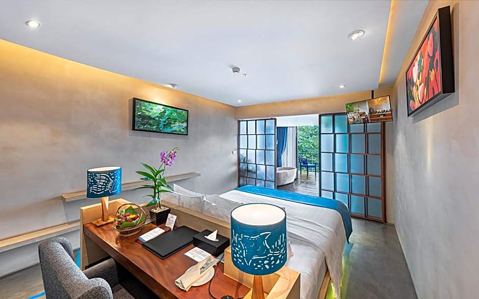 This tastefully appointed, contemporary-styled room is located on the third floor of the hotel that overlooks views of the pool or the city. It features private courtyard access, stucco walls, and a separate lounge area with an attic-styled roof. The bathroom comes with a wooden floor and twin sinks, a free-standing shower and rain shower as well as a spacious bathtub for two. For guests’ convenience, there are a wooden working table, a chair, a 42-inch TV, and a large balcony.